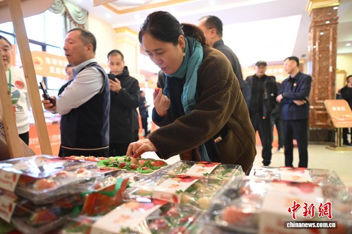 图为年夜会现场市平易近品味草莓。中新社记者 于陆地 摄